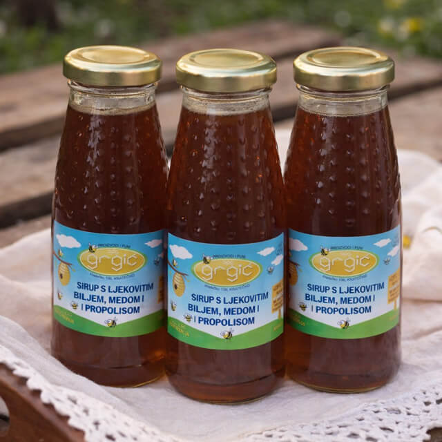 Biljni sirup s medom, propolisom i limunom za dišne puteve i ublažavanje kašlja.